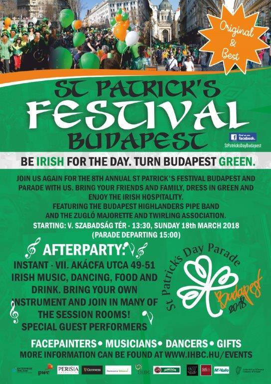 The St. Patrick’s Day Parade in Budapest, organized by the Irish Hungarian Business Circle, promises to be a lot of fun. Irish music, dance, food & drink. The parade starts at 1.30 p.m. (departure at 3 p.m.) on Sunday, March 18th on Szabadság Square- Budapest. Amusement, fun and surprises await! Balloons, face painters, stilts, Zugló – marionette groups, children’s programs – Irish music – food – beverages.